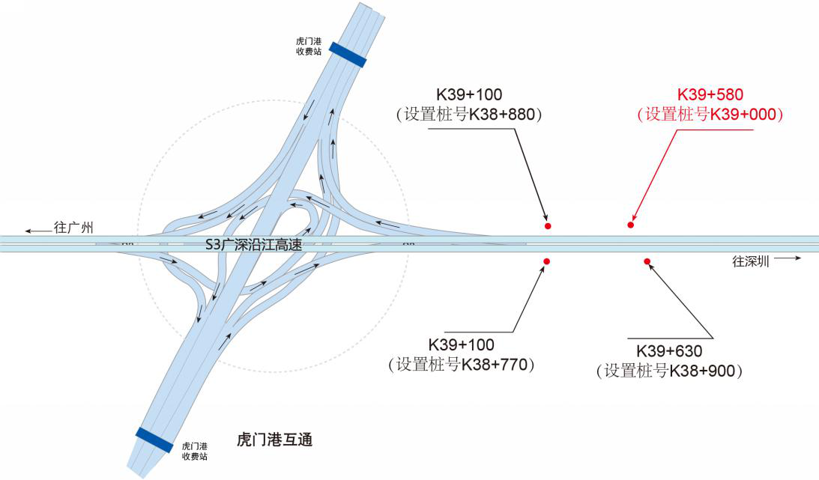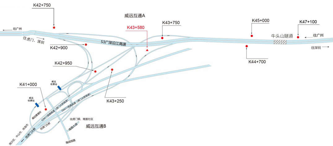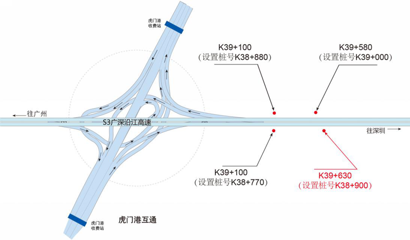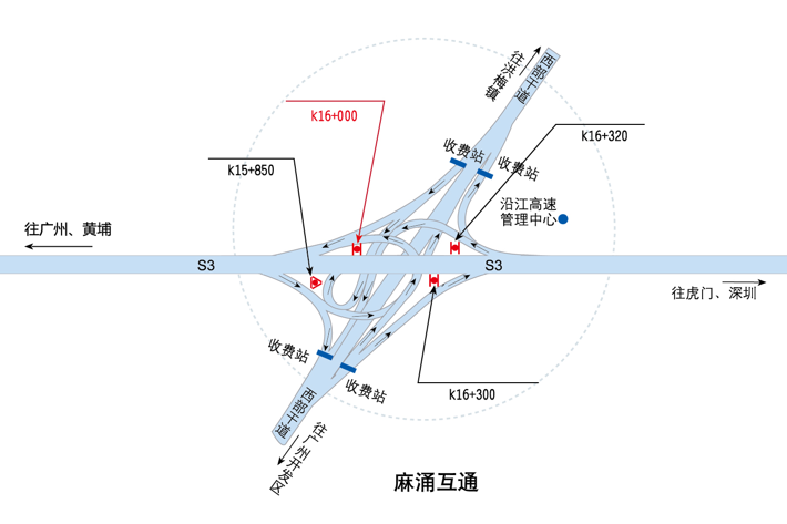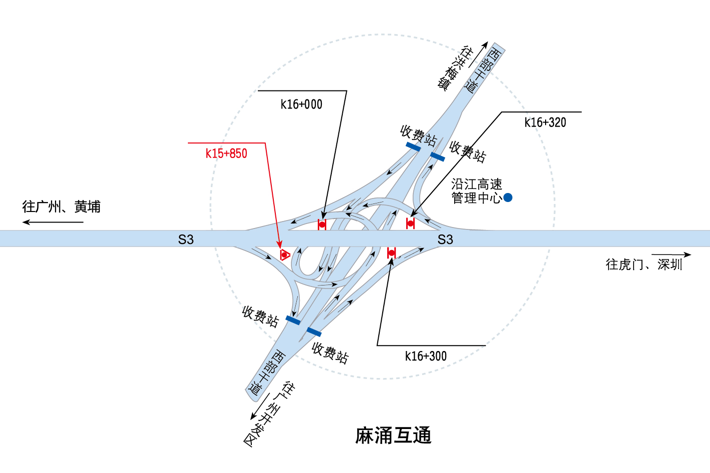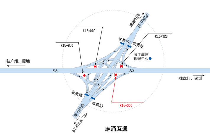 ???????廣深沿江高速公路在沿途設(shè)置12大互通:官田互通、夏港互通,南崗互通,麻涌互通(連接西部干道)、新立沙島互通、洪梅互通(連接鎮(zhèn)際聯(lián)網(wǎng)路5號(hào)路)、民田互通、沙田互通(南沙大橋互通)、虎門(mén)港互通(待建)、威遠(yuǎn)互通、虎門(mén)互通以及長(zhǎng)安互通(連接福海路、?;⒏咚傥妩c(diǎn)梅長(zhǎng)安港支線)、服務(wù)區(qū)一對(duì)(麻涌服務(wù)區(qū))。