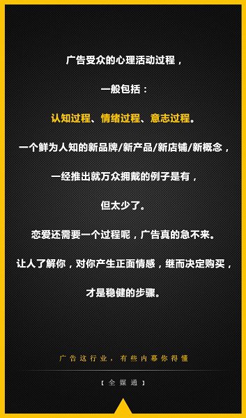 廣告受眾的心理活動(dòng)過程,一般包括:認(rèn)知過程、情緒過程、意志過程。一個(gè)鮮為人知的新品牌/新產(chǎn)品/新店鋪/新概念,一經(jīng)推出就萬眾擁戴的例子是有,但太少了。戀愛還需要一個(gè)過程呢,廣告真的急不來。讓人了解你,對(duì)你產(chǎn)生正面情感,繼而決定購買,才是穩(wěn)健的步驟。