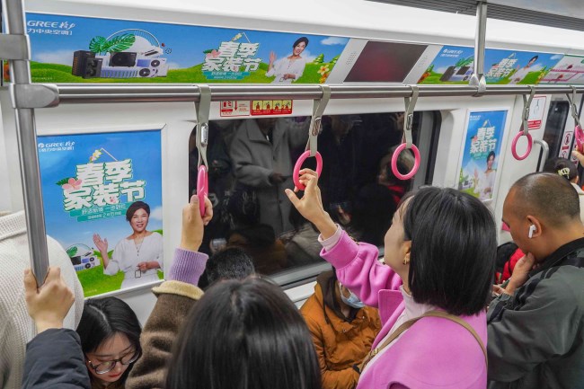 重慶地鐵品牌專列內(nèi)包車廣告由窗頂側(cè)帖橫條與車廂海報看板構(gòu)成,乘客站立抓扶時窗頂貼強制侵入30度仰角視野;坐席休憩時正面看板持續(xù)填充主視域;上下車時窗頂側(cè)帖橫條與車廂海報看板廣告共同觸發(fā)離艙記憶強化。26分鐘滯留期內(nèi)人均接觸廣告≥40次,隧道區(qū)間的黑暗環(huán)境增強屏幕注目率200%。全列廣告獨占形成城市級品牌圖騰,高頻觸達構(gòu)建“軌道民生符號”認知,快消品牌記憶留存率提升60%。成為快消、3C數(shù)碼、餐飲旅游等攻占重慶多圈層市場的優(yōu)質(zhì)廣告載體。