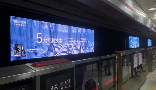 北京地鐵大望路站臺(tái)軌行區(qū)墻面LED大屏廣告位于軌行區(qū)墻面,正對(duì)候車乘客視線。列車進(jìn)站前3-5分鐘的等待期內(nèi),乘客視線自然聚焦屏幕;發(fā)車間隔短,同一乘客單日可能多次接觸,實(shí)現(xiàn)高頻重復(fù)觸達(dá)。獨(dú)占式8聯(lián)裝布局進(jìn)一步強(qiáng)化品牌信息的連續(xù)性與包圍感,避免競(jìng)品干擾站臺(tái)層光照較弱,LED大屏的自發(fā)光特性在暗環(huán)境中形成強(qiáng)烈明暗對(duì)比,成為天然視覺焦點(diǎn)。8聯(lián)裝屏幕構(gòu)建縱向視覺長(zhǎng)廊,畫面細(xì)節(jié)清晰呈現(xiàn)。