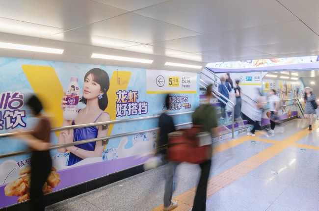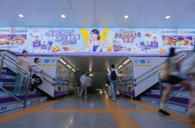 長沙地鐵萬家麗廣場站換乘品牌通道廣告覆蓋2號線轉(zhuǎn)5號線、5號線轉(zhuǎn)2號線雙向客流。2塊梯眉燈箱位于樓梯正上方,乘客仰視上下樓梯時視線自然鎖定,單次閱讀時長 5-8秒;55㎡雙側墻面貼形成“視覺長廊”,雙邊樓梯立面貼沉浸覆蓋,乘客步行通過全程持續(xù)接觸廣告,總曝光時長 40-60秒/人次。立體視覺包圍、動線無遺漏觸達、場景化閉環(huán)轉(zhuǎn)化等優(yōu)勢在乘客消費決策關鍵節(jié)點實現(xiàn)深度滲透?!氨亟?jīng)過道+商圈直連”屬性特別適合快消、零售、文旅及本地生活品牌。