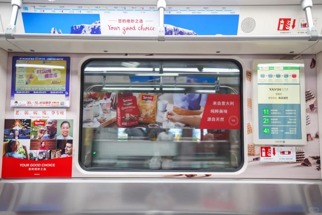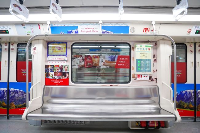 長沙地鐵品牌列車內包車廣告的車窗貼和車窗墻貼平行于乘客視線,閱讀距離≤1米;車門和玻璃貼位于乘客上下車必經觸點,單次閱讀時長5-8秒;車廂框架位于車窗與車門間,利用乘客移動路徑實現二次曝光;車廂壁貼覆蓋車廂內壁,形成品牌信息環(huán)繞。250塊廣告位組合構建沉浸式環(huán)境形成360°品牌空間,消除視角盲區(qū)。乘客從上車至下車全程接觸廣告,平均曝光時長 15-20分鐘/人次。