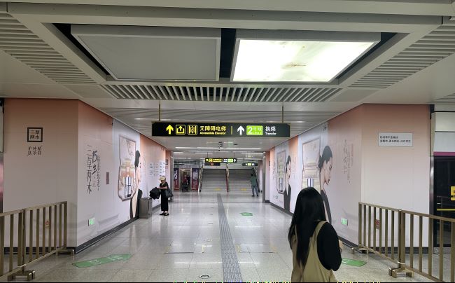 洛陽地鐵解放路站換乘通道兩側(cè)墻貼廣告位于乘客換乘的唯一路徑兩側(cè)。乘客途經(jīng)時視線會自然地掃過墻面,實現(xiàn)高效的近距離觸達。地鐵換乘通道環(huán)境封閉,乘客的注意力不易被外界干擾信息分散,解放路站通道兩側(cè)墻貼廣告展示面積大,傳遞更充分的信息,并帶來較強的視覺沖擊力,能夠與乘客進行長時間的"交流"。墻貼廣告通常沿通道連續(xù)設(shè)置、形成陣列。這種規(guī)?;?、一體化的視覺布局,能對行進中的乘客產(chǎn)生持續(xù)的視覺影響,營造出強烈的品牌陣勢和包圍感,有助于加深品牌印象。