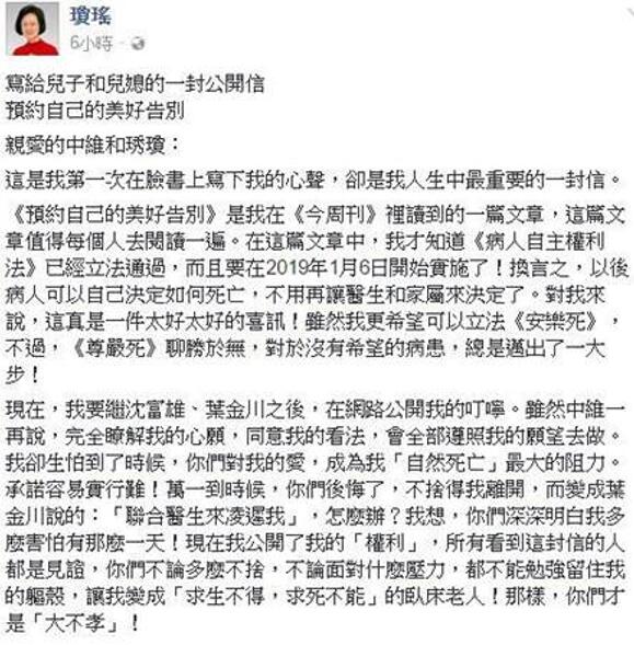 日前,臺(tái)灣知名作家瓊瑤在Facebook公開了一封致兒子兒媳的信,以不容置疑的口吻表達(dá)了對(duì)自己死亡的安排。