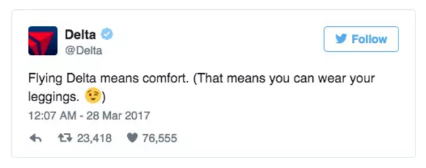 競爭對手達美航空(Delta Airlines)立刻跳出來諷刺美聯(lián)航:在我們這兒大家可以穿Leggings,我們就是要讓大家飛得舒服!
