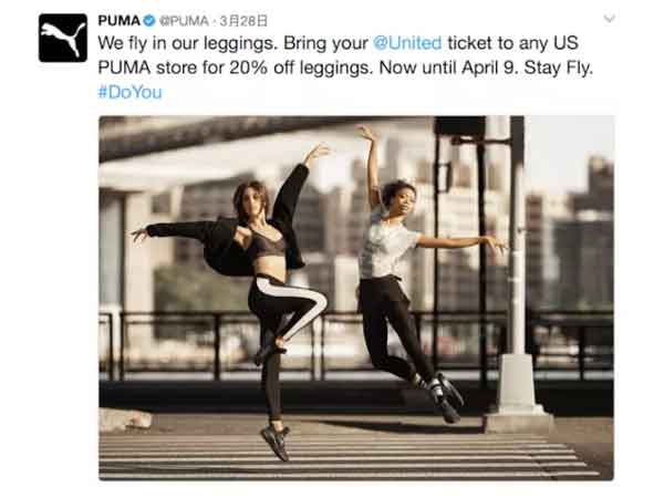也有直接而粗暴的營銷,比如彪馬(Puma)——拿著美聯(lián)航的機票到任意一家美國Puma店買Leggings,就可享受20%的折扣!