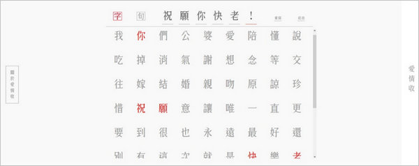 16. 唯一的缺點(diǎn)是“留言就送手寫情書”的活動(dòng)只能通過(guò)Facebook參加,(臺(tái)灣不懂大陸的傷悲,就像白天不懂夜的黑)。至于廣告片、《愛(ài)情收》情書展、軟文推廣之類的手段沒(méi)什么可說(shuō)的,倒是“愛(ài)情體定制巧克力”讓人眼前一亮——用戶在網(wǎng)上自己選定文字,華康字型制作并送到戀人手中。