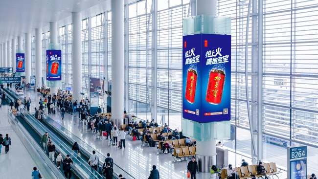 廣州機場T2國內出發(fā)到達混流區(qū)巨型包柱套裝廣告每根包柱套裝由4個廣告面環(huán)繞組成,形成完整的360度展示。無論旅客從哪個方向行走或停留,視線都無法避開廣告信息,包柱廣告于候機區(qū)座椅旁,正對旅客視線。單柱廣告面積達56.64㎡,三套組合形成總計約170㎡的連貫展示群。在開闊的機場空間內,這種“頂天立地”的垂直巨幅展示形態(tài),具有天然的視覺存在感和沖擊力,能有效吸引注意力并承載清晰的品牌形象和核心信息。