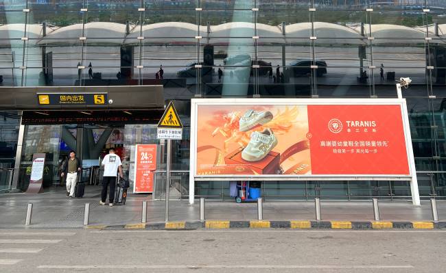 南寧機(jī)場(chǎng)T2航站樓三層國(guó)內(nèi)出發(fā)廳大門入口處站立式燈箱廣告位于航站樓玻璃墻與戶外行車道之間,正處于旅客從室外進(jìn)入室內(nèi)的空間轉(zhuǎn)換節(jié)點(diǎn)。旅客在此區(qū)域的視線會(huì)自然投向建筑入口,廣告內(nèi)容能夠直接進(jìn)入視野,形成旅客對(duì)機(jī)場(chǎng)商業(yè)環(huán)境的第一印象。單塊燈箱規(guī)格寬近8米,高度超過(guò)3米,總面積達(dá)25平方米以上。這種超寬的橫向構(gòu)圖與現(xiàn)代化航站樓的建筑尺度相協(xié)調(diào),在開闊明亮的入口環(huán)境中依然具備強(qiáng)烈的視覺存在感。