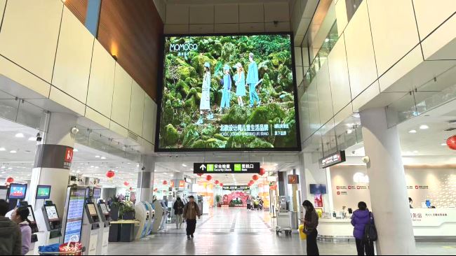 泉州晉江機場國內(nèi)出發(fā)中央通道上方墻面LED大屏廣告正處于旅客行進動線的核心,高空位置的設(shè)置確保了廣告信息在較遠(yuǎn)距離外就能被識別,實現(xiàn)了中遠(yuǎn)距離的視覺觸達(dá)。大廳中央的位置使屏幕成為整個空間的視覺焦點,無遮擋的展示環(huán)境進一步增強了廣告的視覺效果。6.4米高、5.76米寬的屏幕尺寸在開闊的機場環(huán)境中仍能保持顯著的視覺存在感,為品牌創(chuàng)造了良好的展示條件。高頻率的循環(huán)播放策略能夠充分利用旅客通過中央通道的時段,對不同批次的旅客進行反復(fù)提示。