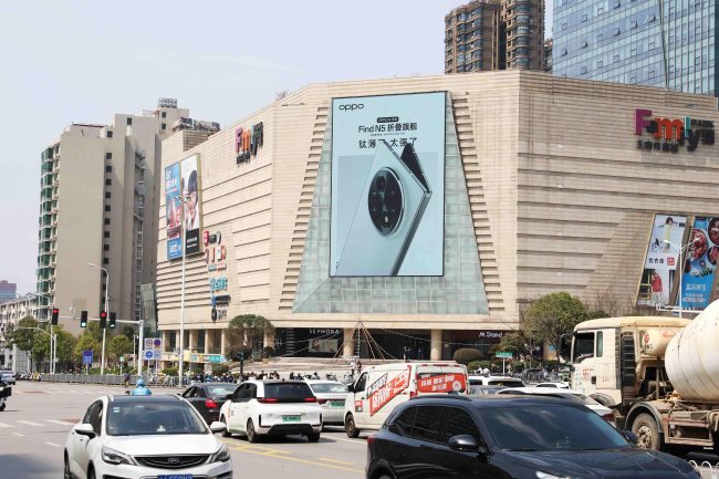 長沙王府井百貨主屏LED大屏廣告地標(biāo)占位,384㎡巨幕形成河西制高點(diǎn),500米外清晰可辨,144㎡屏體輔屏近距補(bǔ)充,針對路口緩行車輛及行人。金星大道南北向車流直面主屏,桐梓坡路東西向車流及過街人流同步觸達(dá)輔屏,消除視角盲區(qū)。